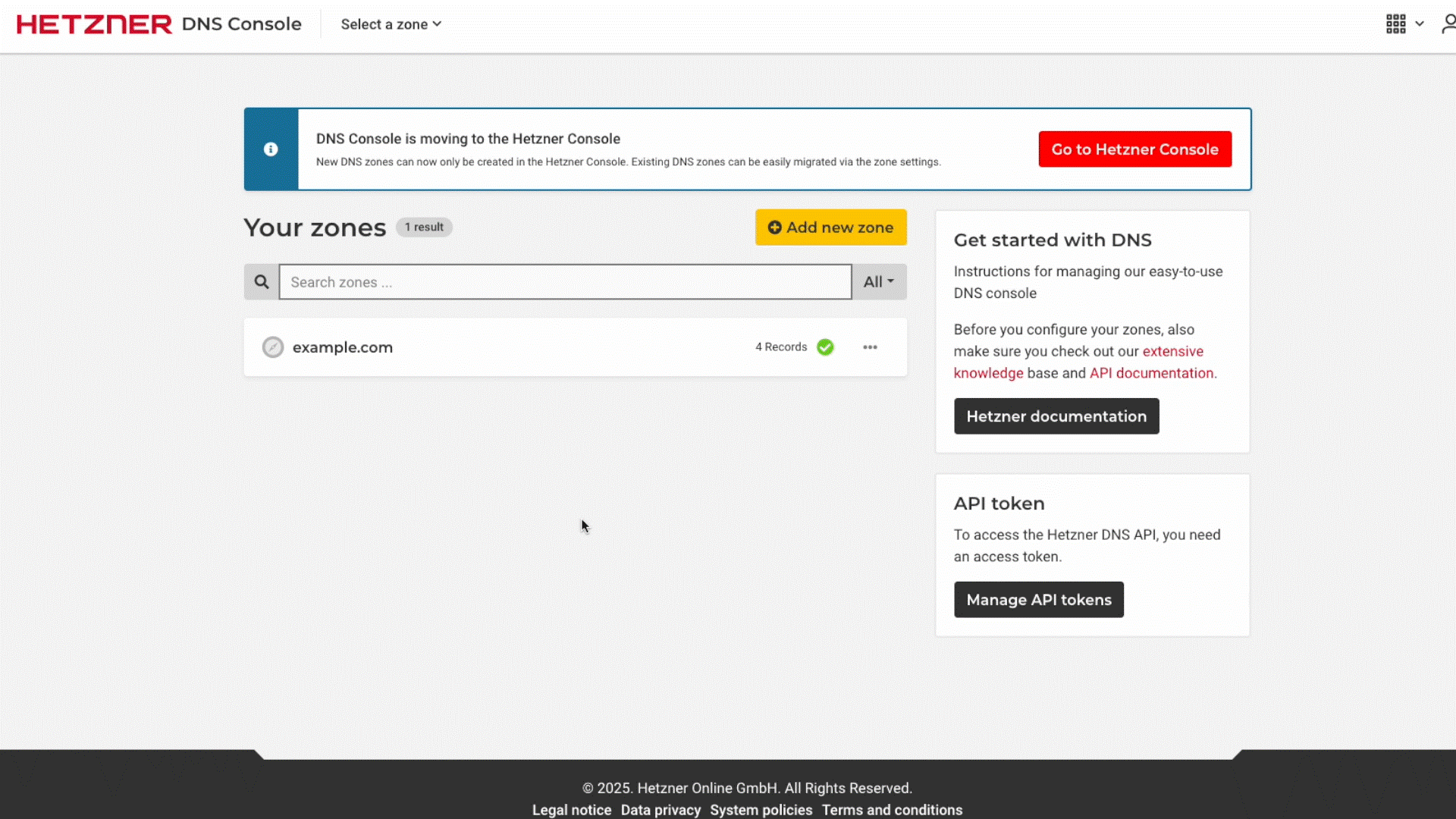 Die Migration einer bestehenden Zone von der DNS Console in die Hetzner Console muss manuell ausgelöst werden, existierende Zonen werden nicht automatisch migriert. Die Migration ist ein einmaliger Vorgang, der nicht rückgängig gemacht werden kann! Sie können die Migration entweder über die DNS Console oder die DNS API starten.